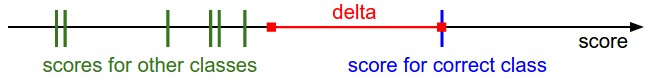 There are several ways to define the details of the loss function. As a first example we will first develop a commonly used loss called the Multiclass Support Vector Machine (SVM) loss. The SVM loss is set up so that the SVM “wants” the correct class for each image to a have a score higher than the incorrect classes by some fixed margin \(\Delta\). Notice that it’s sometimes helpful to anthropomorphise the loss functions as we did above: The SVM “wants” a certain outcome in the sense that the outcome would yield a lower loss (which is good).