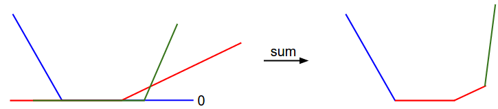 \[\begin{align} L_0 = & \max(0, w_1^Tx_0 - w_0^Tx_0 + 1) + \max(0, w_2^Tx_0 - w_0^Tx_0 + 1) \\\\ L_1 = & \max(0, w_0^Tx_1 - w_1^Tx_1 + 1) + \max(0, w_2^Tx_1 - w_1^Tx_1 + 1) \\\\ L_2 = & \max(0, w_0^Tx_2 - w_2^Tx_2 + 1) + \max(0, w_1^Tx_2 - w_2^Tx_2 + 1) \\\\ L = & (L_0 + L_1 + L_2)/3 \end{align}\]Since these examples are 1-dimensional, the data \(x_i\) and weights \(w_j\) are numbers. Looking at, for instance, \(w_0\), some terms above are linear functions of \(w_0\) and each is clamped at zero. We can visualize this as follows: